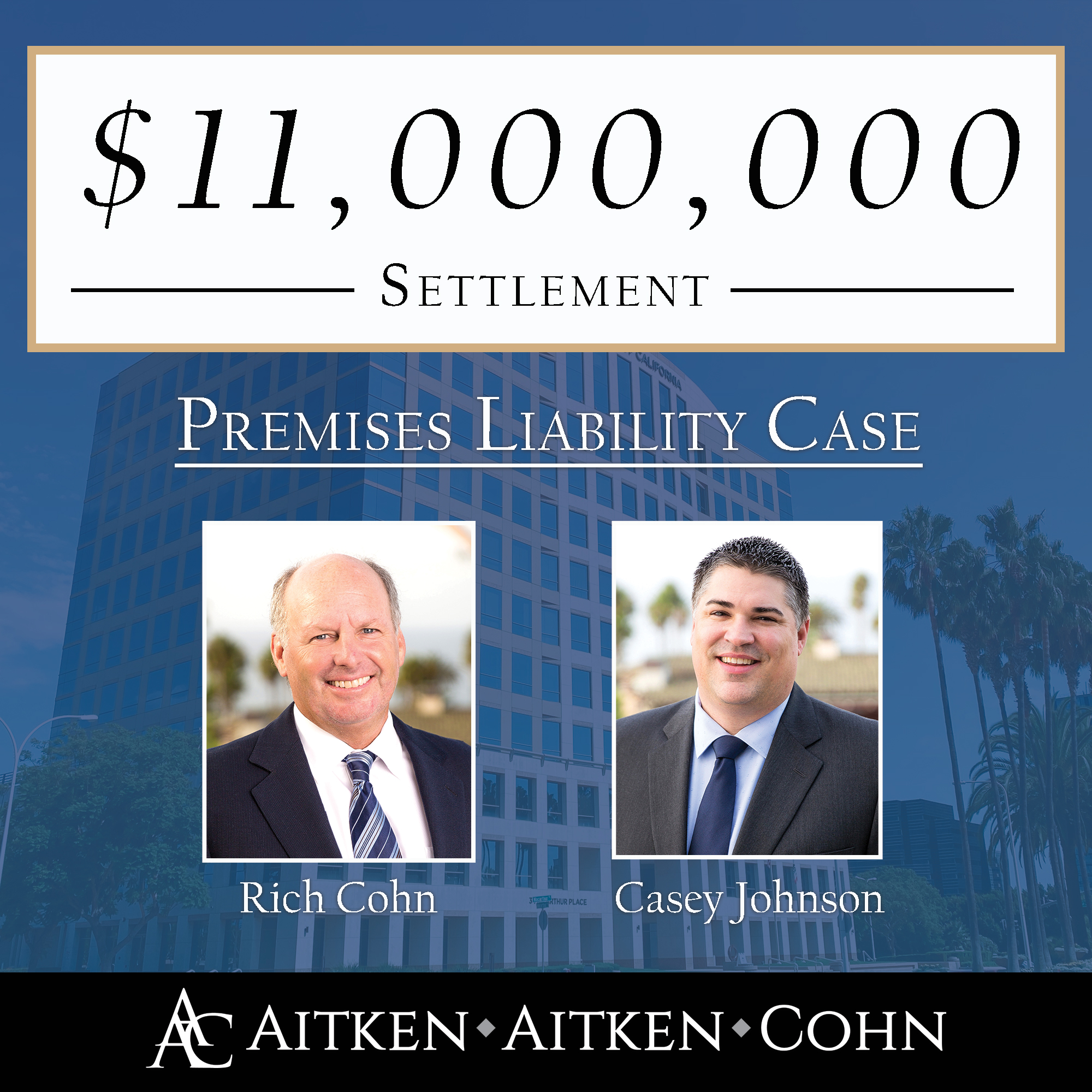 Partners Rich Cohn and Casey Johnson secured an $11,000,000 settlement on behalf of a 20-year-old client who was rendered a quadriplegic after diving into an unsafe HOA swimming pool.