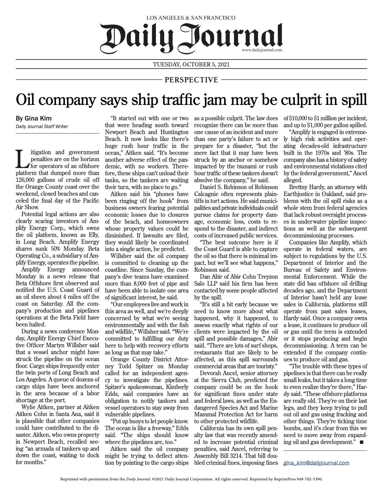 Wylie Aitken Offers Legal Insight to the LA Daily Journal Following Oil Spill